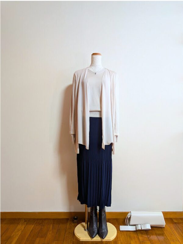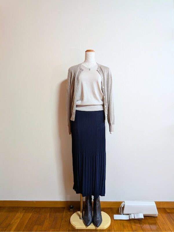 ライトベージュカーディガン+ネイビーニットスカート