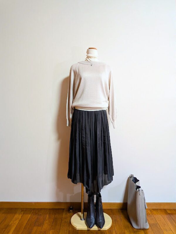 アイボリーノースリーブニット+ブラックギャザースカート