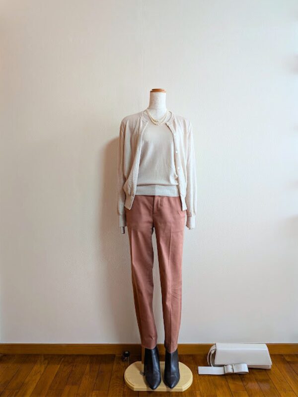 ライトベージュカーディガン+ピンクパンツ