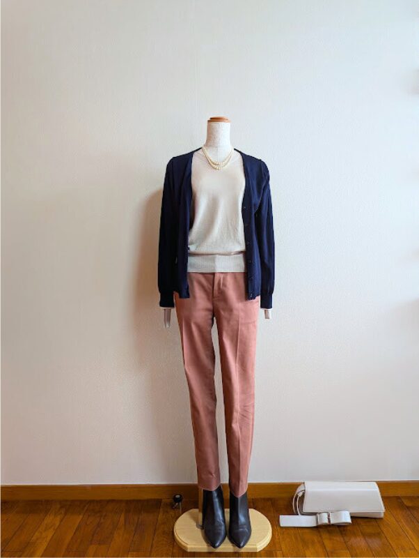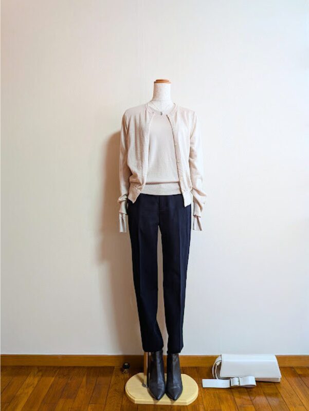 ライトベージュカーディガン+ネイビーパンツ