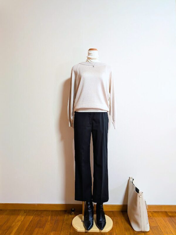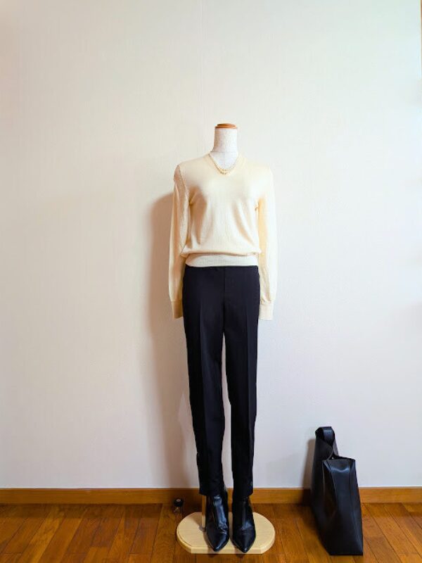 アイボリーノースリーブニット+ブラックパンツ