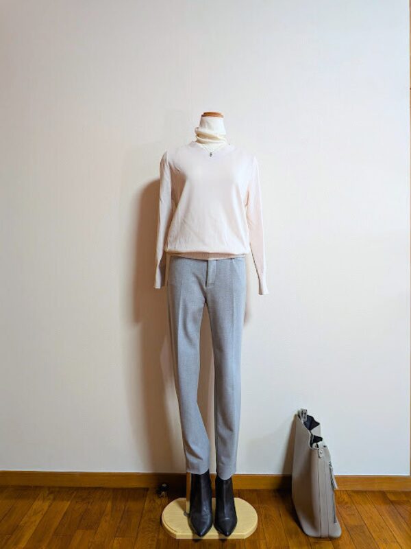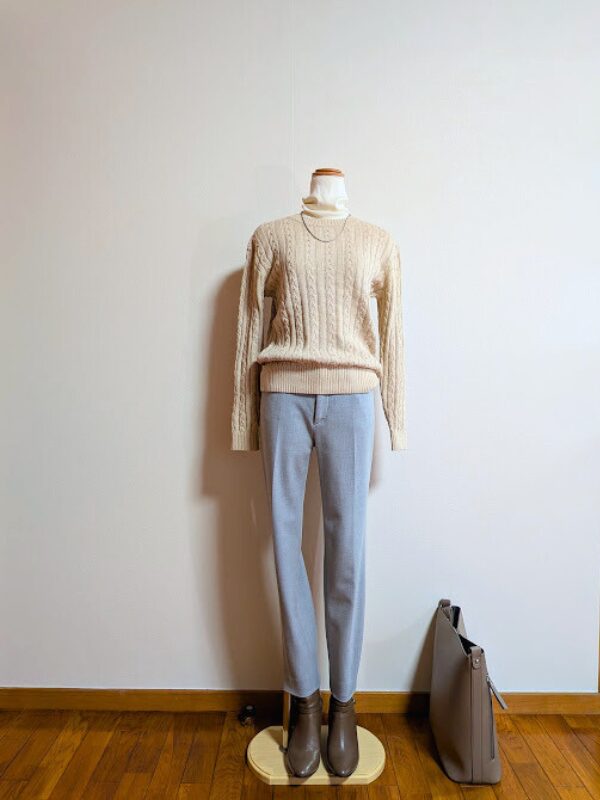 アイボリーニット+ライトグレーパンツ