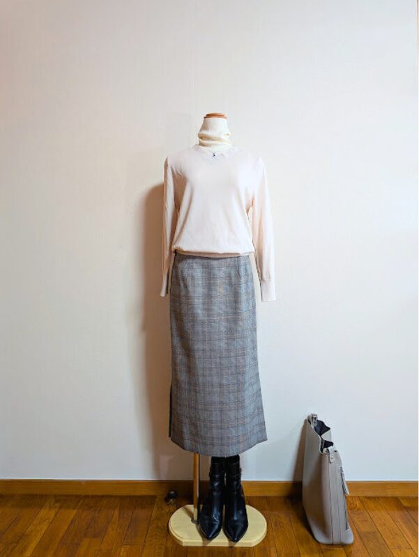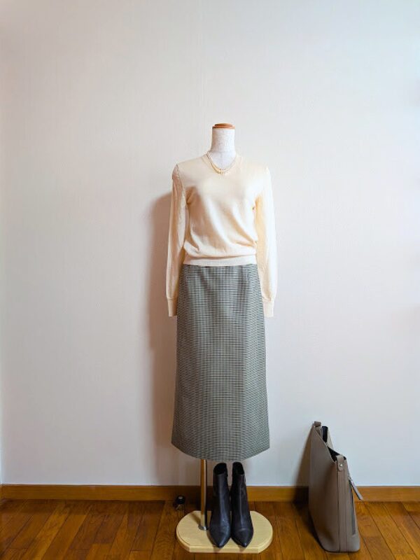 アイボリーノースリーブニット+グレーチェックスカート