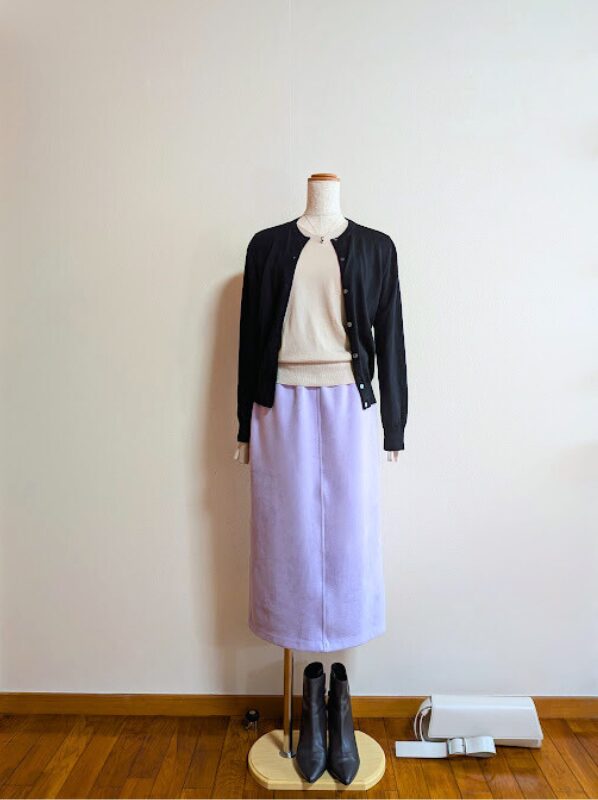 ブラックカーディガン+ラベンダースカート
