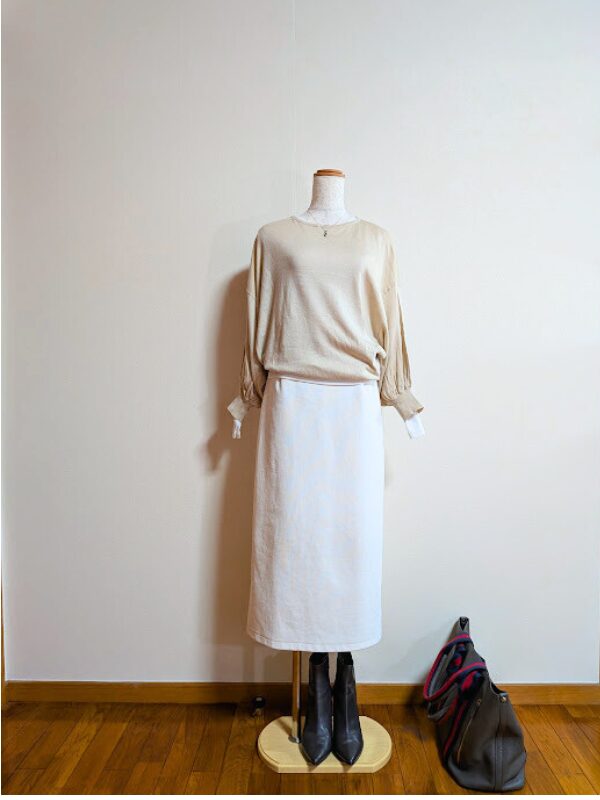 ホワイトブラウス+ベージュスカート