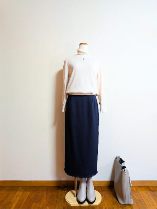 アイボリーノースリーブニット+ネイビースカート