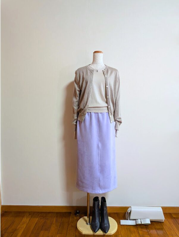 ブラウンカーディガン+ラベンダースカート