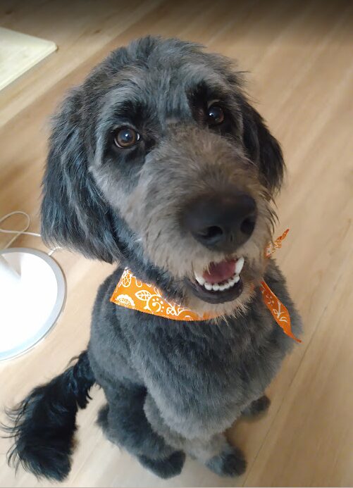 トリミング後のイヴには、かわいいオレンジのスカーフが。