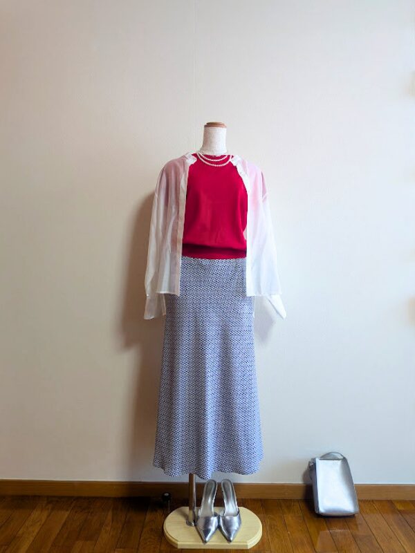 同じトップス(レッドニット×ホワイトシアーブラウス)でも、 スカートをブルーに変えるだけで印象が大きく変わります。