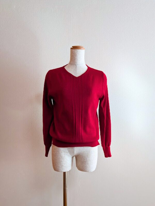 深みのある赤のVネックは、しっかりとした編地で温もりを感じます。