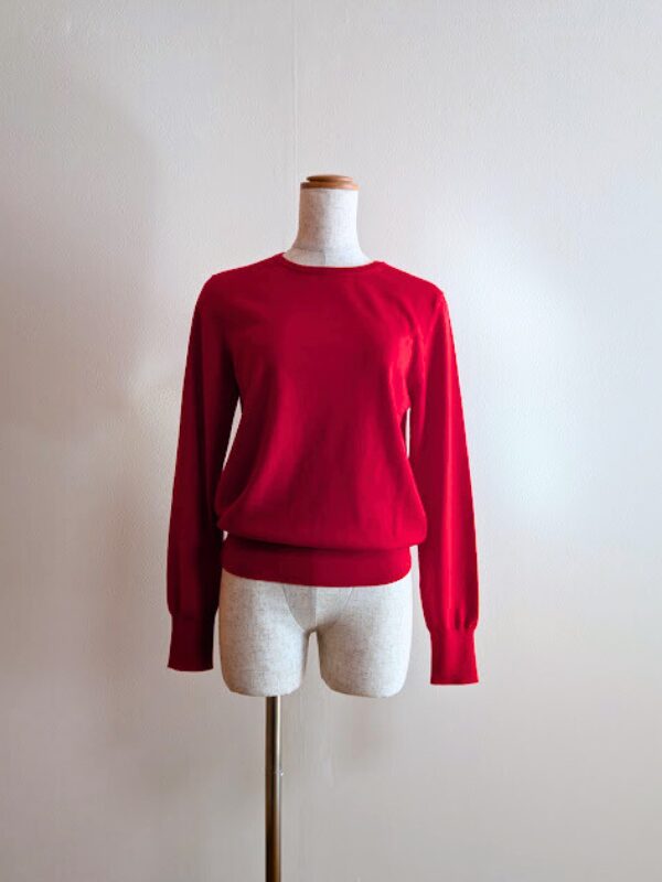 軽やかに光を含むクルーネックは、明るめの赤が空気に溶けるように広がり、