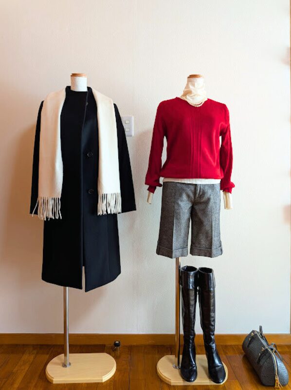 そして——撮影の舞台裏は、重いコートと格闘しながら、バッグやブーツで部屋じゅうが“赤の日の余韻”!?