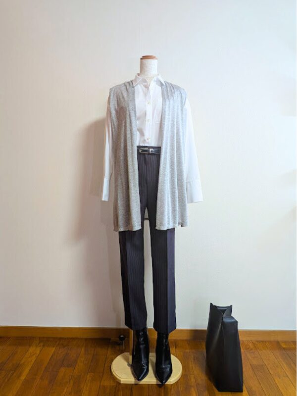ジレも素材違いで印象が変わりますね。こちらは優し気。
