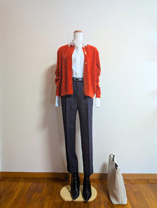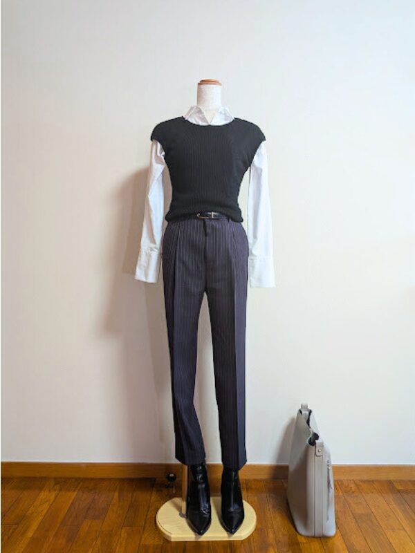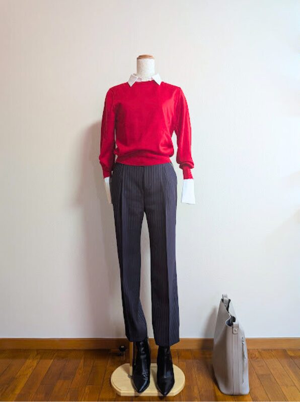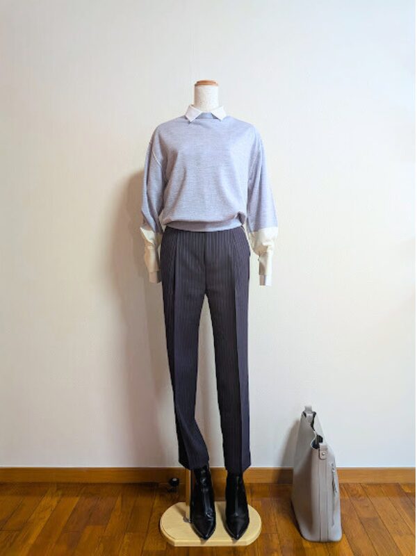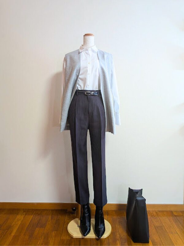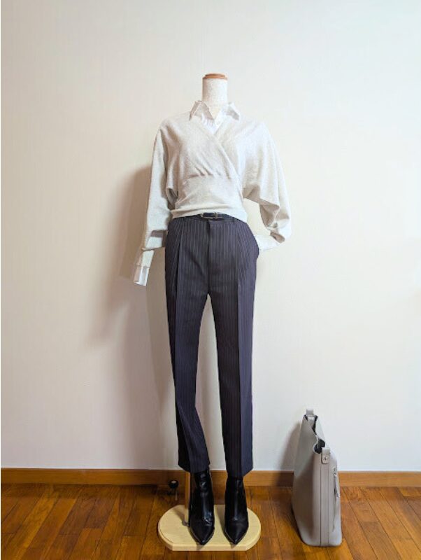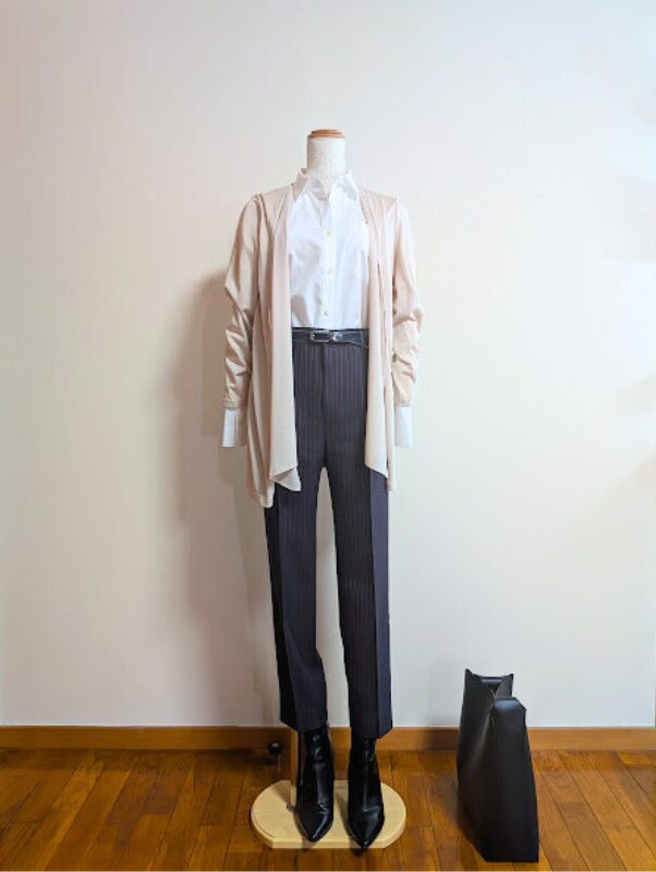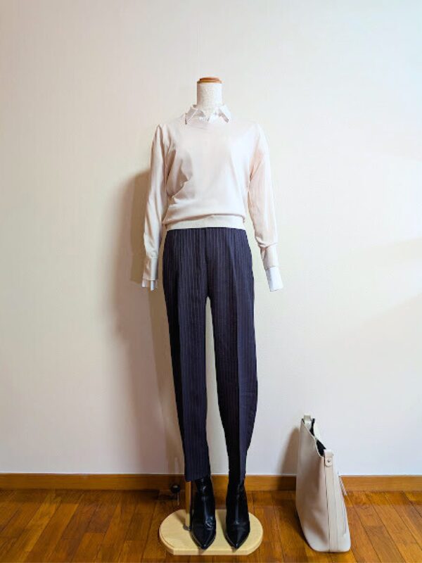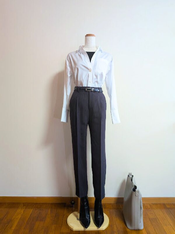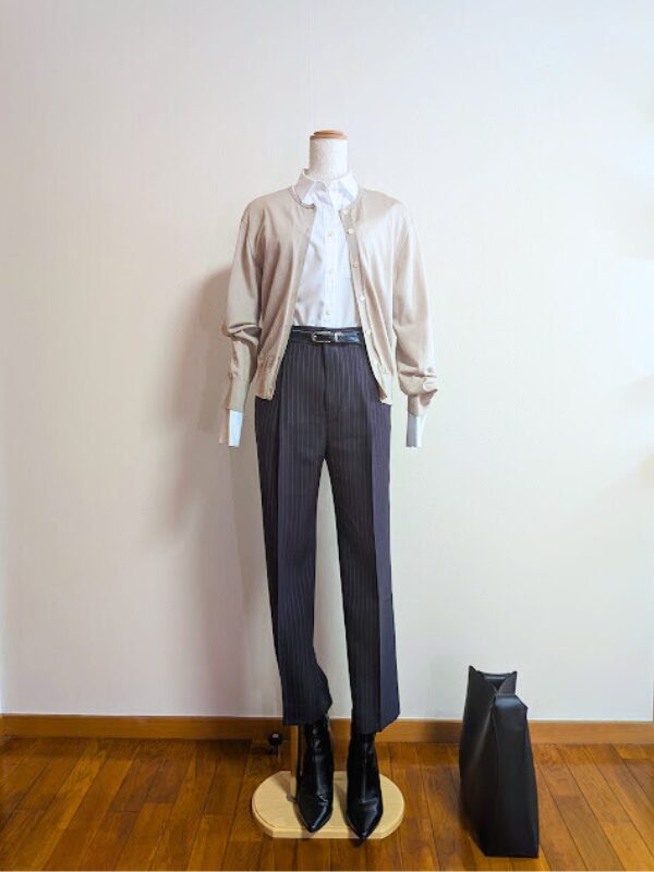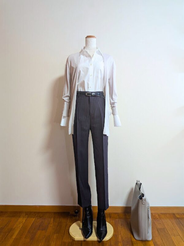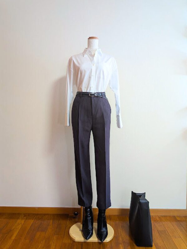 シャープさと柔らかさを併せ持つこのパンツが、ホワイトブラウスの“余白”を引き立ててくれました。